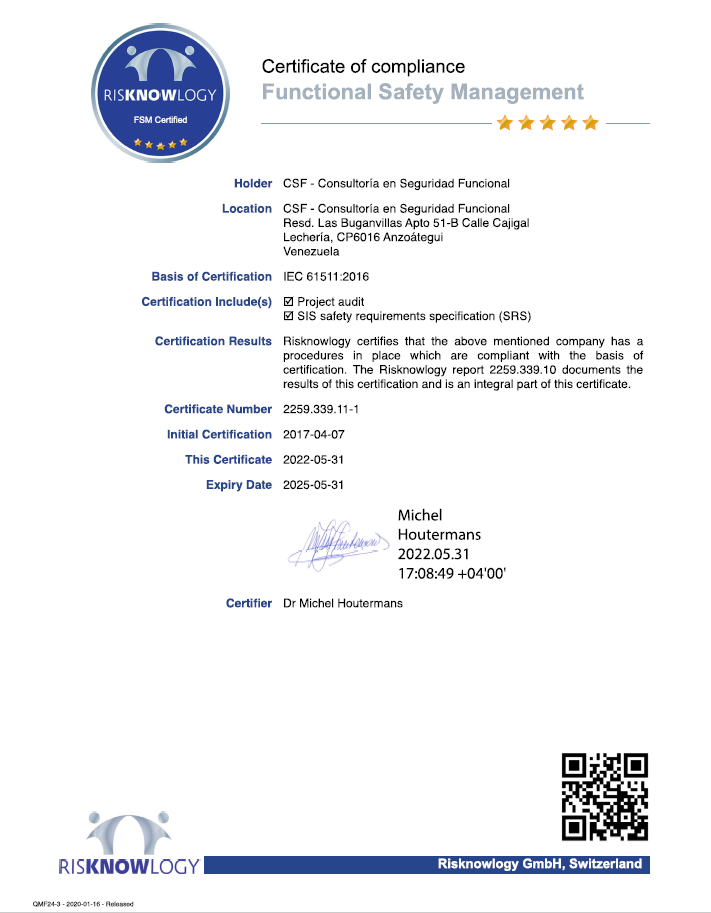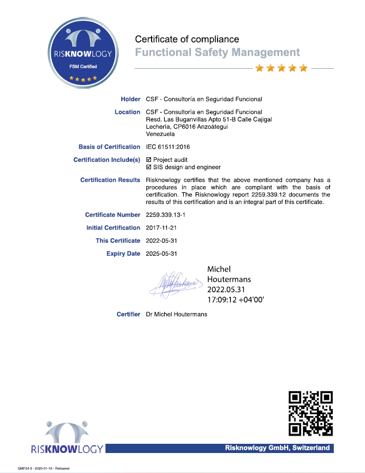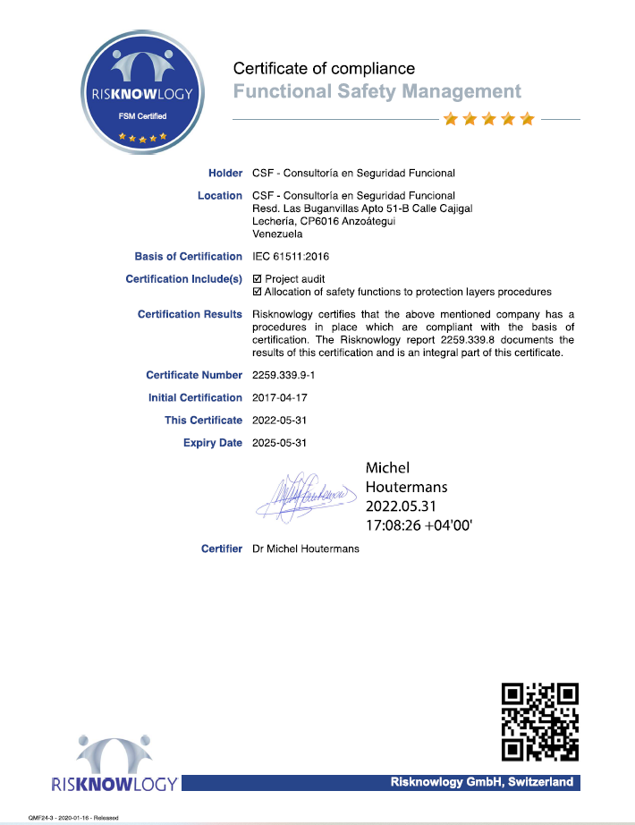 Únicos en Latinoamérica con un Sistema de Gestión de Seguridad Funcional con procedimientos certificados conforme a la norma IEC 61511: 2016